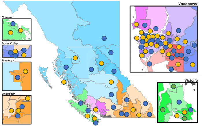Fair Voting BC has submitted a proposal for a Regional Representation model (see figure) that aims to satisfy seven key democratic principles that our current First-Past-the-Post system fails to, while minimizing both practical and political obstacles to implementation. Learn more about the Regional Representation model here.
